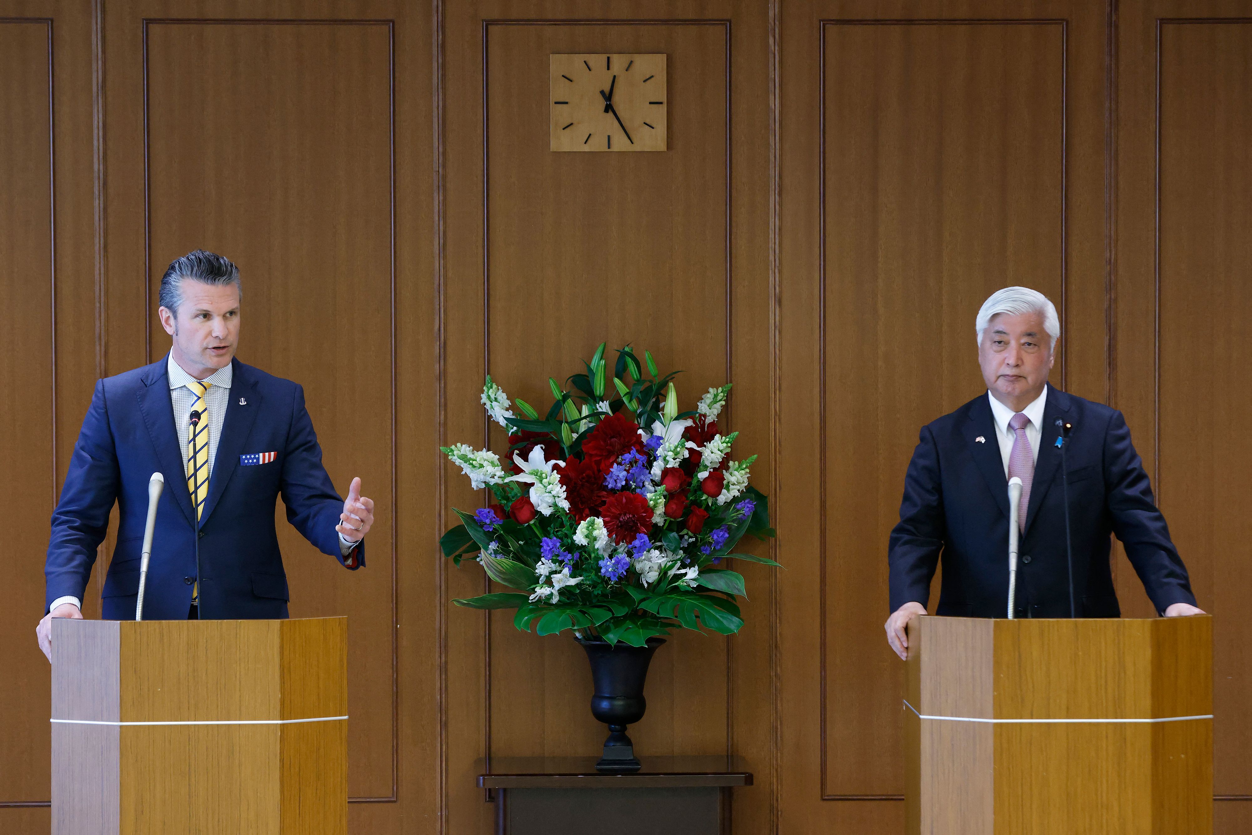 3月30日,日本防卫相中谷元(右)与美国国防部长赫格塞思在东京出席新闻发布会。(法新社)