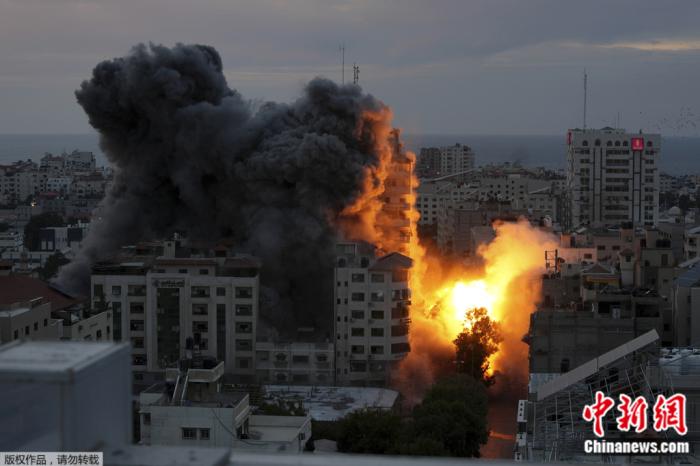 当地时间2023年10月7日,以色列空袭加沙地带,一座巴勒斯坦公寓大楼爆炸,火球和烟雾上升。