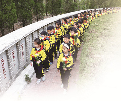 山东省枣庄市文化路小学学生在枣庄革命烈士陵园缅怀先烈。新华社发