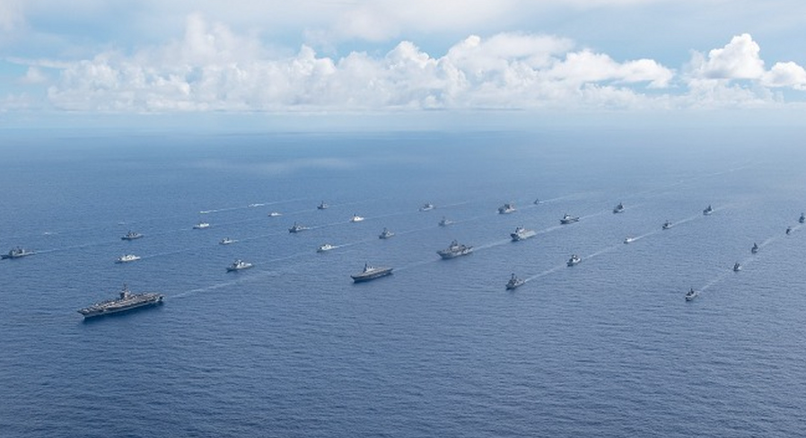 参加“2025太平洋斯特勒”联合演习的美、法、日三国舰艇在海上编队航行。