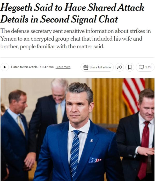 知情人士说,与《大西洋》月刊群聊泄密事件不同的是,戈德堡是被美国高级官员错误拉进群聊中,而新曝光的群聊是赫格塞斯在1月创建的,群聊成员包括其妻子和“专业核心圈”人士。