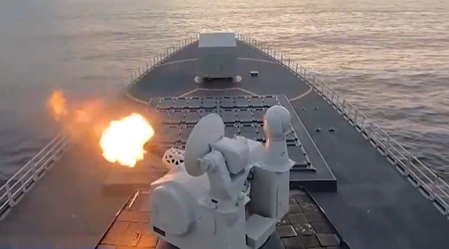 咸阳舰立即按照防空作战要求对当前空域搜索,判明目标属性后,咸阳舰精准捕捉来袭“敌”导弹,并对多批次空中目标进行火力拦截。与此同时,银川舰数枚干扰弹升空,形成干扰屏障,舰载副炮同步锁定目标,经过一轮炮火攻击,空中威胁解除。