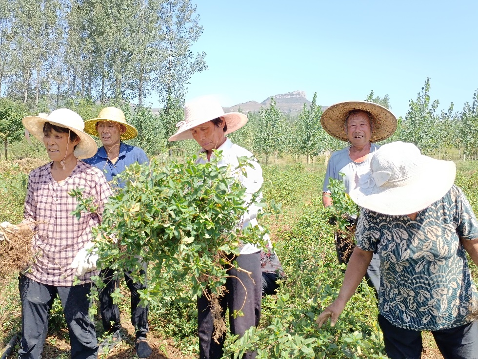 平邑县流峪镇车庄村金银花种植大户李英带领村民进行田间管理和苗木移栽工作