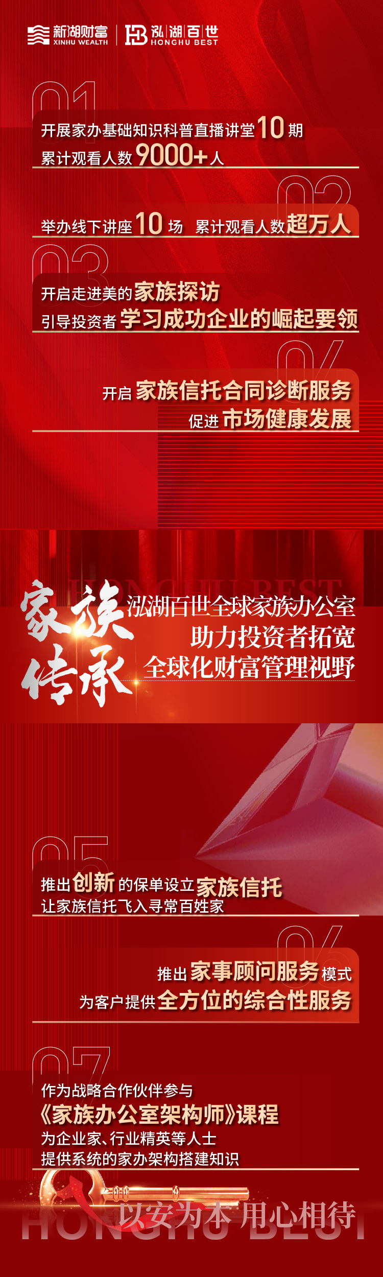 在对财富管理市场新刚需板块的把控上,新湖财富旗下泓湖百世全球家族办公室,以“全球视野,中国情怀”为发展目标,用最新的研究成果“传承规划思维导图”“从契约型基金到家族办公室”助力家族传承目标,并以“华人家族传承研究院”“保单直通设立家族信托”引领创新,为广大客户带来更全面、更高品质的传承服务。
