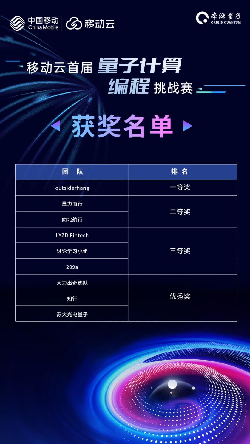 同时在活动当日公布了移动云首届量子计算编程挑战赛获奖名单。经过激烈角逐,最终由outsiderhang团队获得一等奖,由量力而行团队和向北航行团队获得二等奖,由LYZD Fintech团队、讨论学习小组团队和209a团队获得三等奖,以及大力出奇迹队、知行团队和苏大光电量子团队获得优秀奖,并于4月25日进行了颁奖仪式。