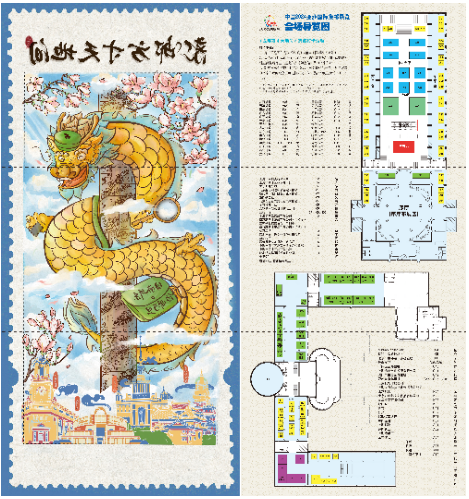 此外,由上海邮政特别为本次邮展设计定制的“龙游方寸天地间” 打卡导览图十分抢眼。正面一条祥龙腾空而起,穿越祥云,在上海市花白玉兰的掩映下,鸟瞰上海诸多地标建筑,每一片龙鳞都是一个盖章处,分别对应《陋室铭》中一个字。观众从导览图背面的指引可以一边逛各个有趣的展位,一边集戳,最终可集齐一篇“有龙则灵”的古文佳作。