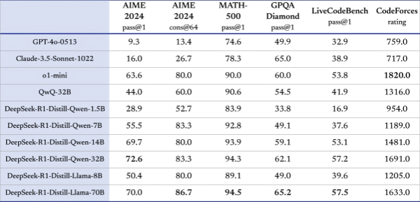 DeepSeek蒸馏小模型的性能测评(图片来源:Deepseek)