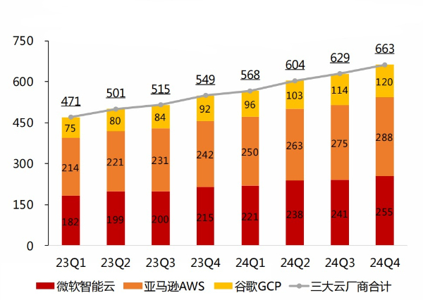 此前云业务增速难以突破的背后,主要原因在于AI云服务需求旺盛,但云厂商算力容量受限,算力容量供给不足。例如,微软于2024年第二季度率先表态供给受限,而谷歌和亚马逊也在2024年第四季度表态算力供给不足。
