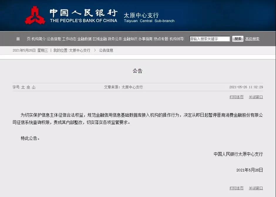 中国人民银行太原中心支行公告称,决定从即日起暂停晋商消费金融股份有限公司征信系统查询权限,责成其内部整改,切实落实各项监管要求。