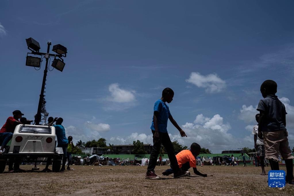 8月21日,孩子们在海地莱凯用作临时避难所的体育场内玩耍。