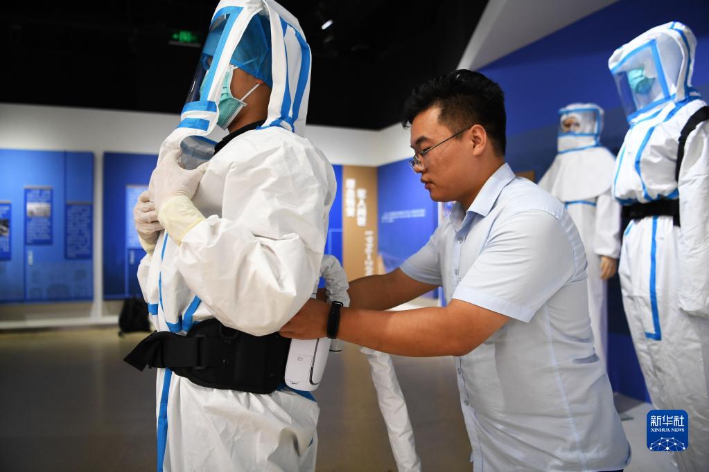 8月26日,在位于河南新乡长垣市的驼人集团,工作人员在试穿“空调防护服”。