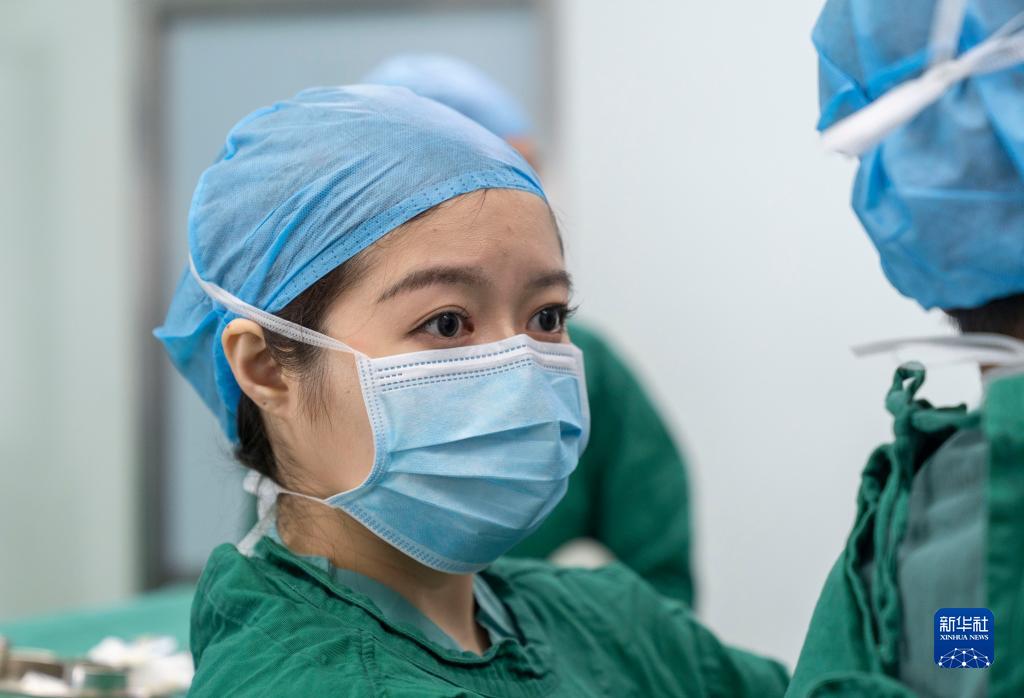 11月5日,在北京市第六医院的医联体胸外科病房手术室,北京协和医学院实习医生董袭莹在团队协作中开展荧光腔镜精准肺段手术。