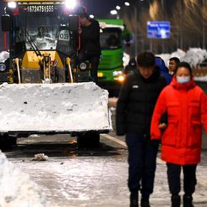 11月10日,在内蒙古通辽市,作业车辆清理城区路面积雪。