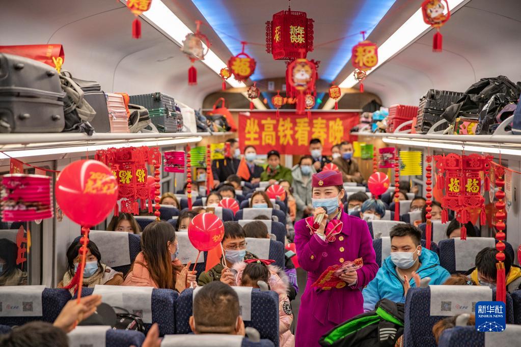 春节临近,中国铁路成都局集团有限公司重庆客运段联合重庆铁路公安处组织青年职工,将重庆西北环线C451次列车装扮一新,在做好疫情防控的前提下,为旅客带来一场自编自演的“高铁春晚”,让奔波的旅客增添欢乐,在旅途中体验别样“年味”。