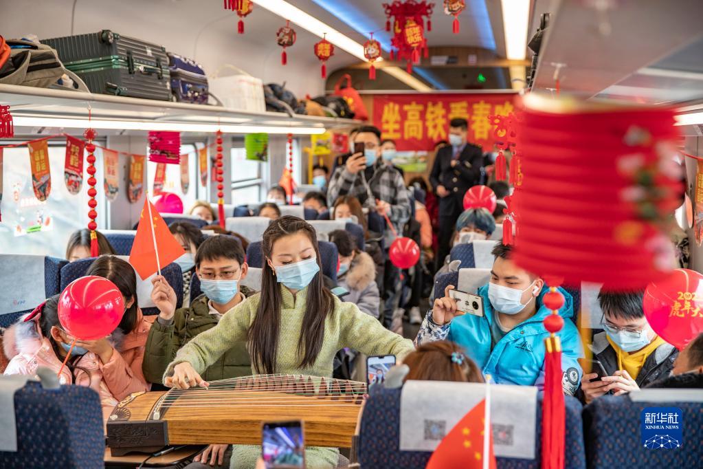 1月28日,在重庆西北环线C451次列车上,中国铁路成都局集团有限公司重庆客运段的青年职工为旅客弹奏古筝。