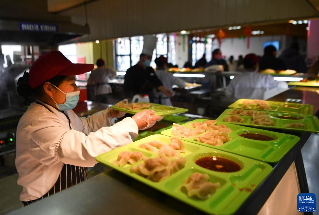 1月29日,工作人员在西安交通大学兴庆校区校园食堂准备午餐。