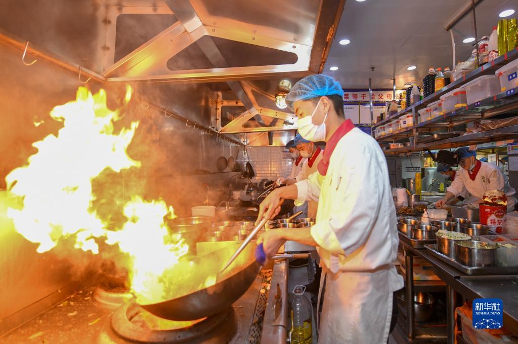 1月31日,在天津市南开区某餐饮企业厨房内,厨师在炒制菜肴。