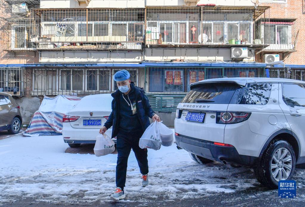 1月31日,在天津市南开区某社区,天津市某餐饮企业经理冯海涛将外带年夜饭送入市民家中。