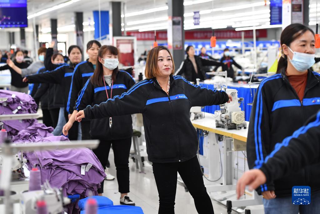 在位于延安市延川县马家河社区郭家河村的服装社区工厂内,工人在做工间操(3月31日摄)。
