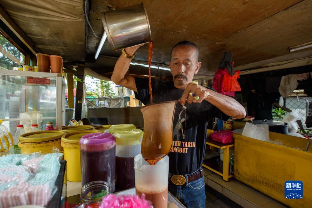 5月18日,在马来西亚雪兰莪州的必打灵查亚,穆赫德·扎布里在制作拉茶。穆赫德·扎布里在必打灵查亚经营拉茶店已超过20年,他制作的拉茶深受当地居民喜爱。