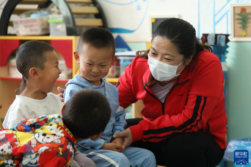 6月1日,牟苹丽在幼儿园和小班的小朋友交流。