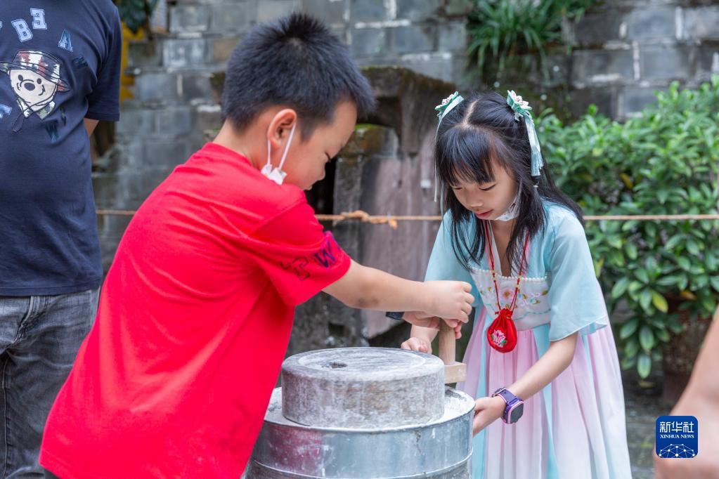 6月5日,在川菜博物馆,小朋友在体验磨豆花。