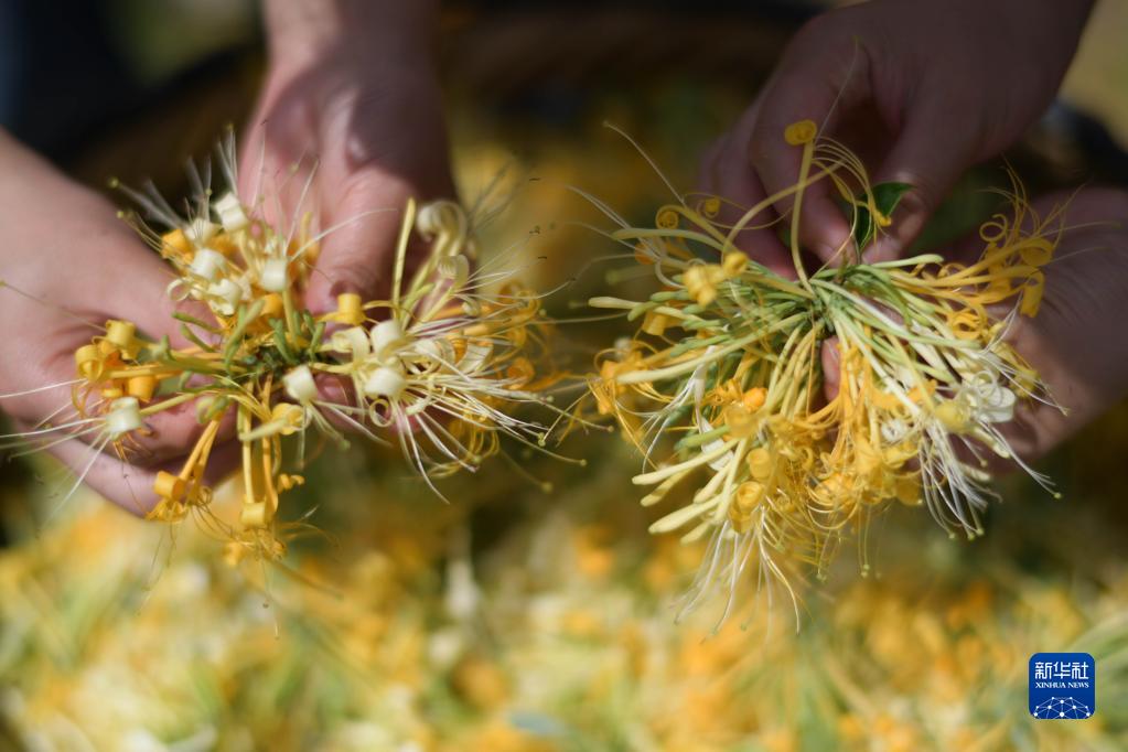 盛夏时节,贵州省绥阳县满山遍野的金银花进入采收季,当地群众抢抓晴好天气采收、分拣、加工金银花。