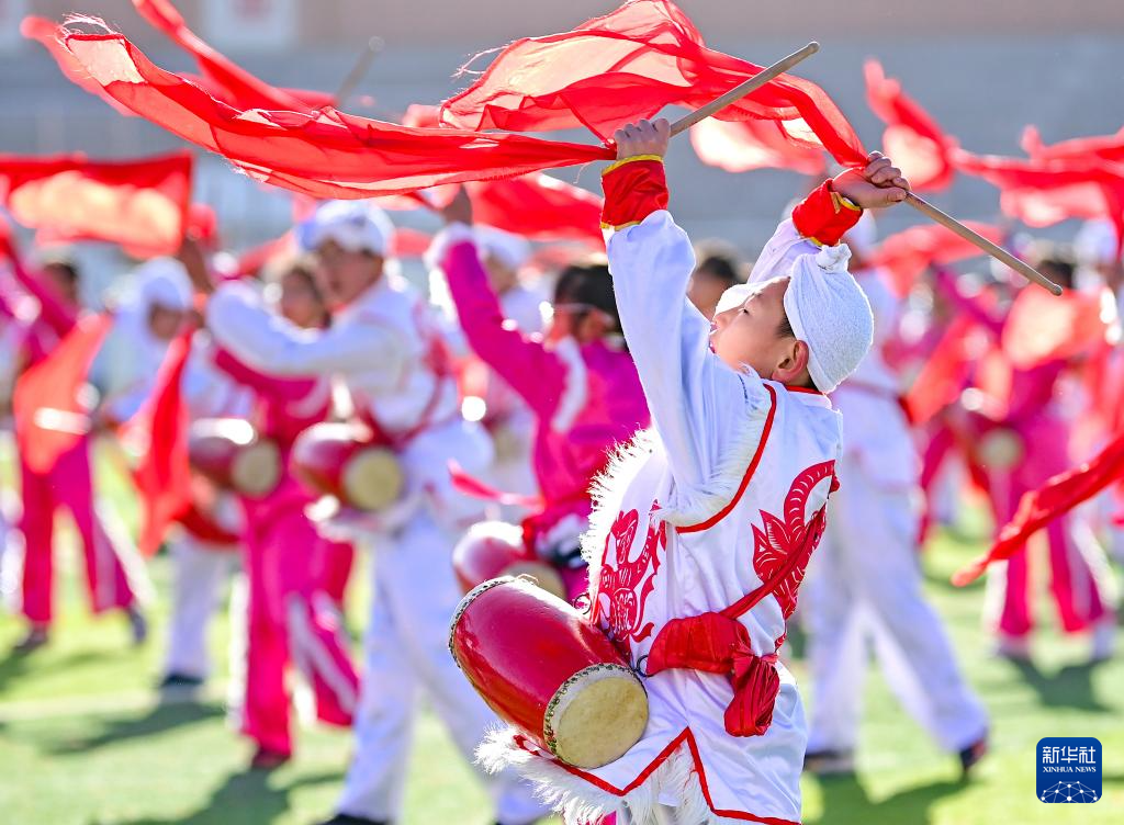 11月16日,内蒙古鄂尔多斯市鄂托克前旗第二小学的学生在大课间表演安塞腰鼓。该校将安塞腰鼓列入学校的校本课程和大课间活动,聘请民间艺人传授技艺,让非遗文化在校园中传承。