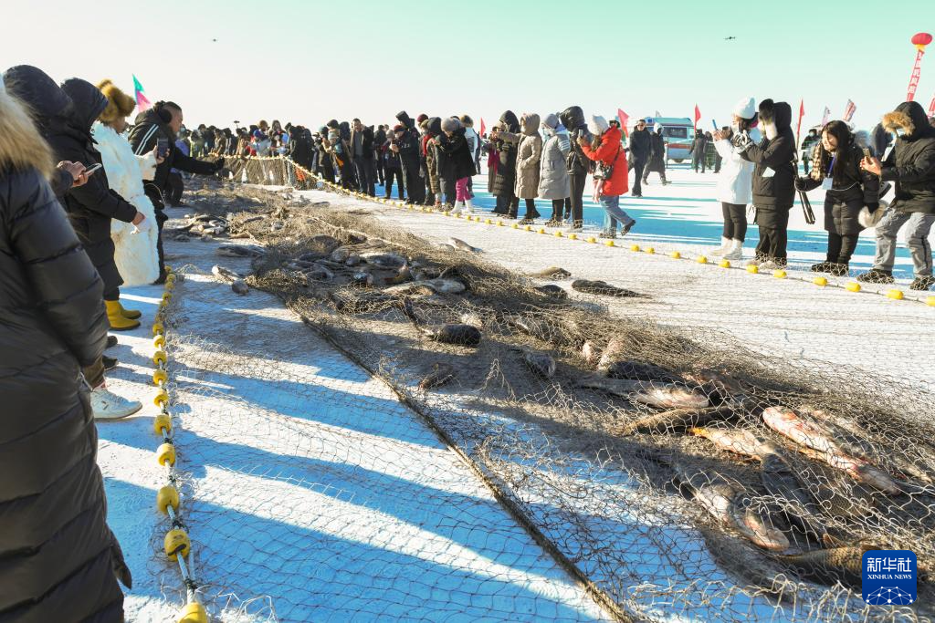 这是12月27日在黑龙江省大庆市杜尔伯特蒙古族自治县的连环湖冰面上拍摄的冰湖出鱼场景。