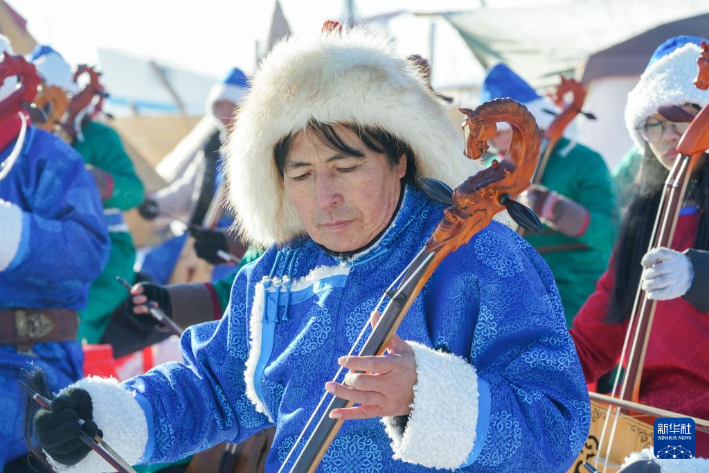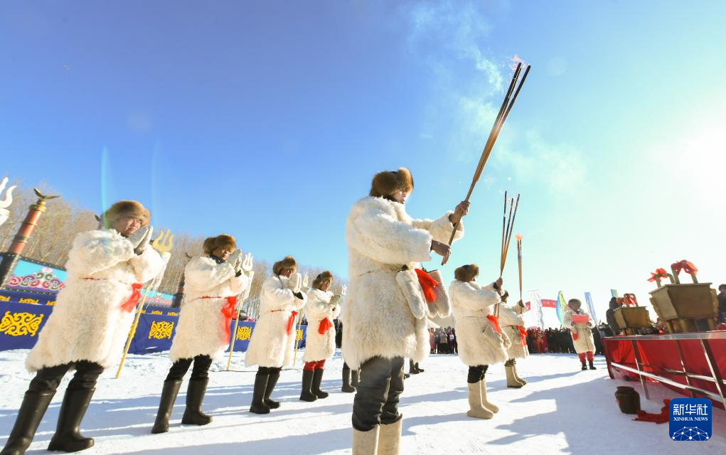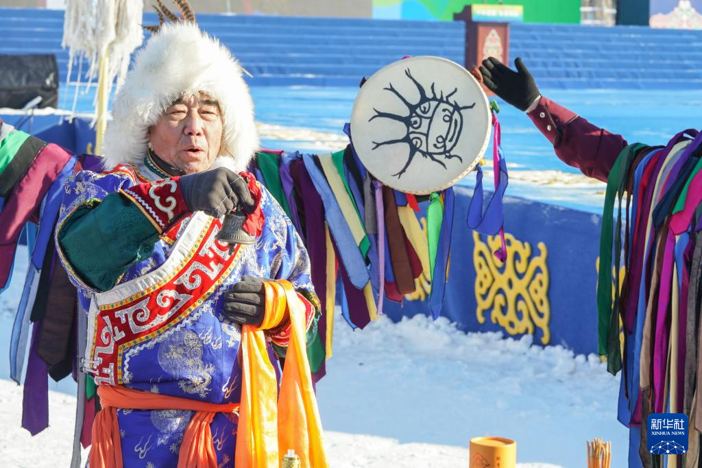 12月27日,在黑龙江省大庆市杜尔伯特蒙古族自治县的连环湖冰面上,人们进行祭湖醒网展示表演。