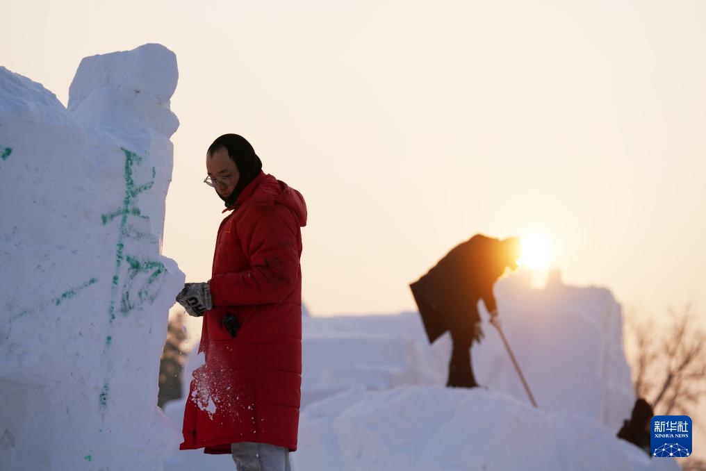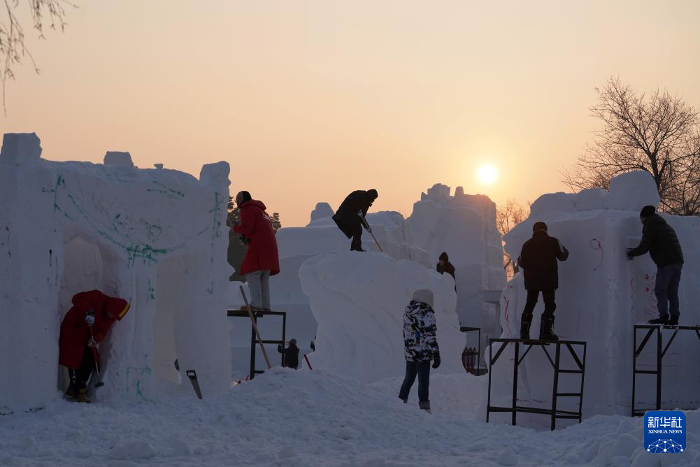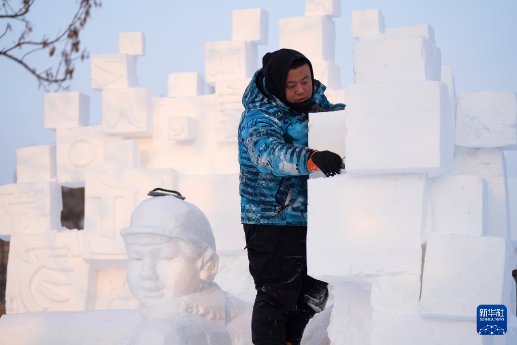 12月28日,在太阳岛雪博会园区,第三十届全国雪雕比赛参赛选手在进行雪雕创作。