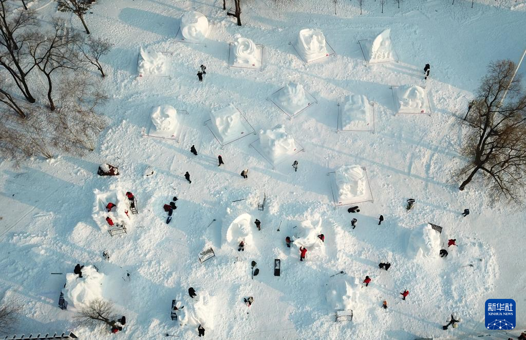 12月28日,在太阳岛雪博会园区,第三十届全国雪雕比赛参赛选手在进行雪雕创作(无人机照片)。