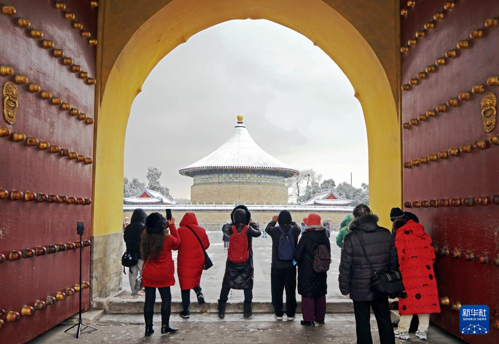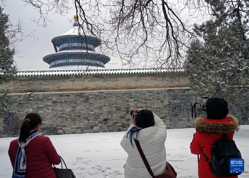 游客在天坛公园拍摄雪景(12月11日摄)。天坛始建于明永乐十八年(1420年),是世界上现存规模最大、保存最完整的古代祭天建筑群,1998年被列入世界文化遗产名录。