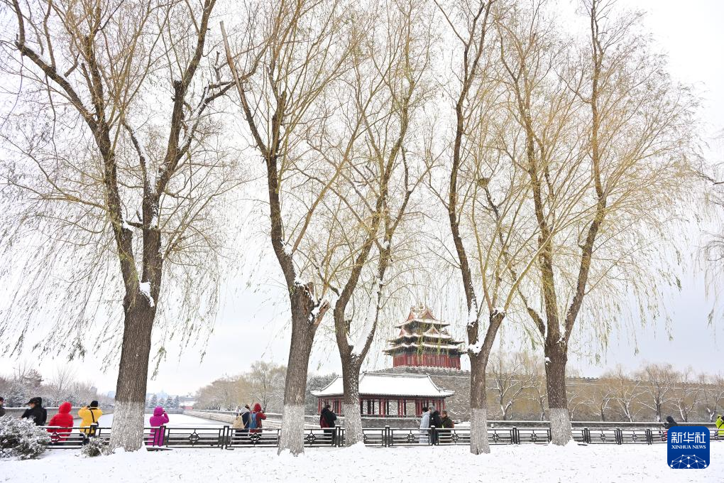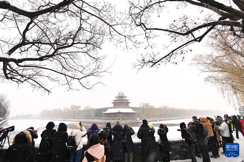 游客在故宫赏雪(12月14日摄)。始建于1406年的故宫是世界上现存规模最大、最完整的古代木构宫殿建筑群,位于北京中轴线的中心。1987年联合国教科文组织将其列入世界文化遗产名录。