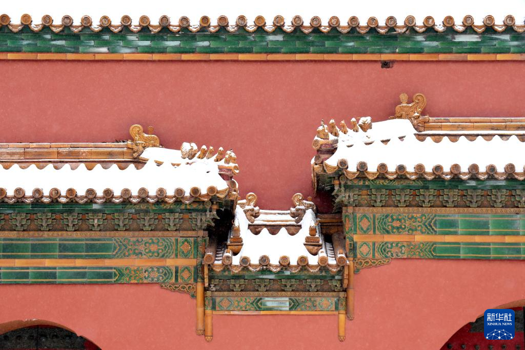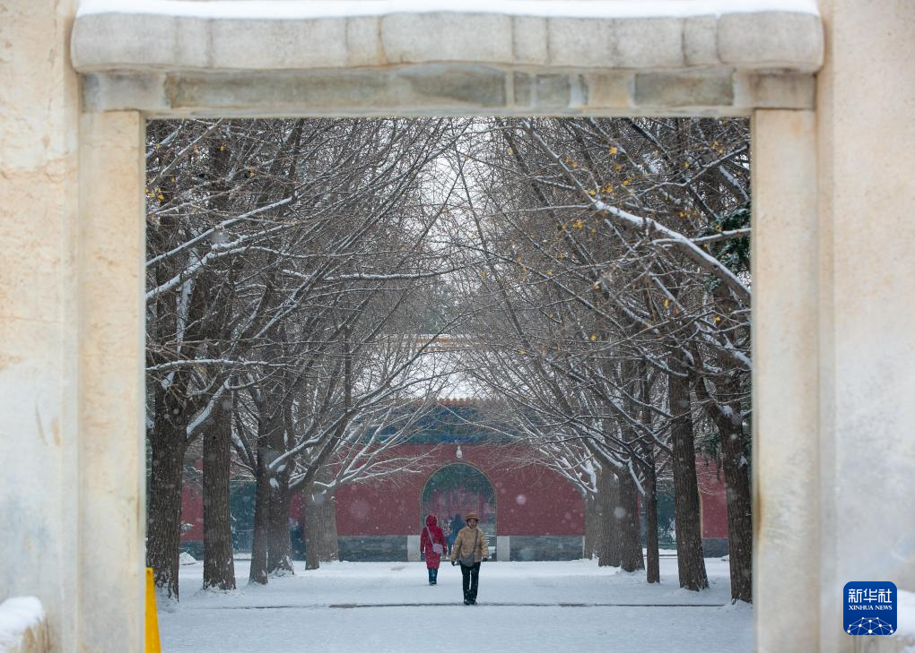 雪中的太庙前琉璃门东侧旁门(12月14日摄)。太庙始建于明永乐十八年(1420年),占地19.7万平方米,是明清两代皇帝祭祀祖先的场所,是我国现存最完整、规模最宏大的皇家祭祖建筑群。