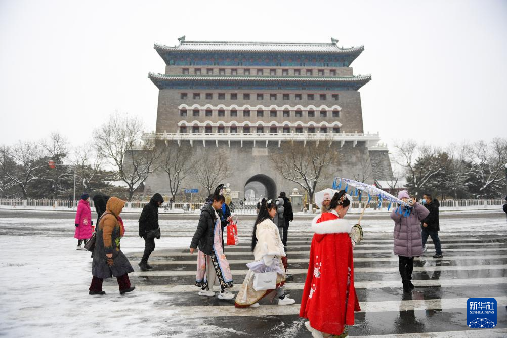 游客行走在雪后的正阳门箭楼前(12月14日摄)。正阳门是中国明、清两代王朝都城的正南门,坐落在老北京城的南北中轴线上,俗称前门。1988年,正阳门城楼和箭楼被国务院批准列入第三批全国重点文物保护单位。