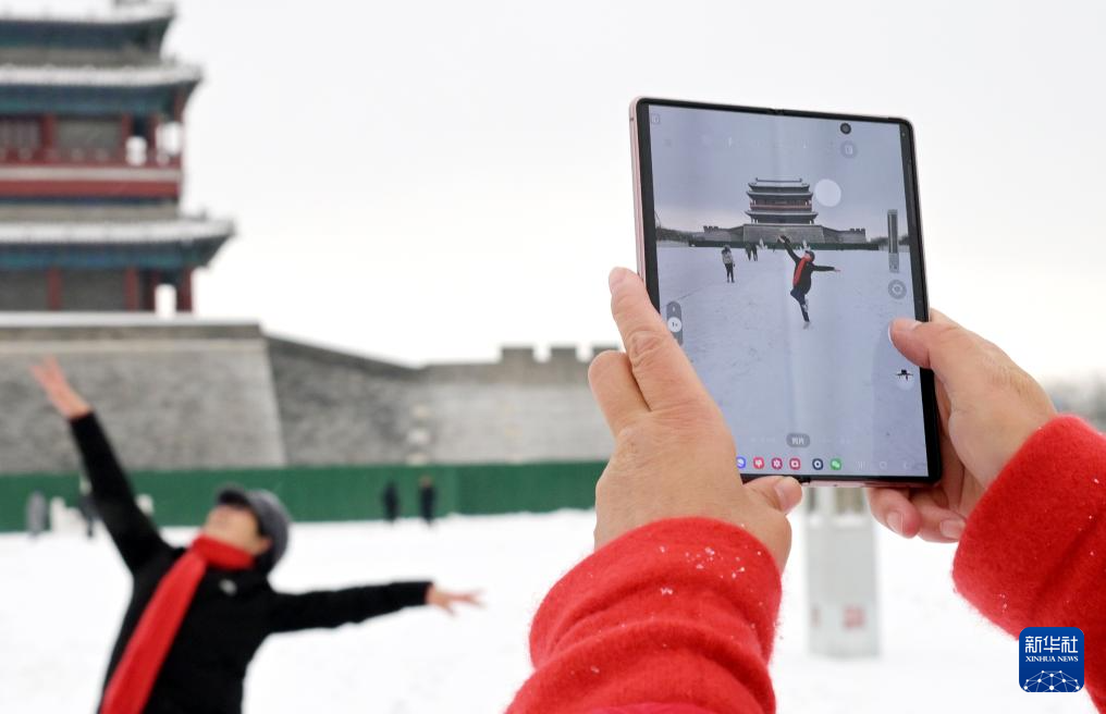 市民在拍摄雪中永定门(12月11日摄)。