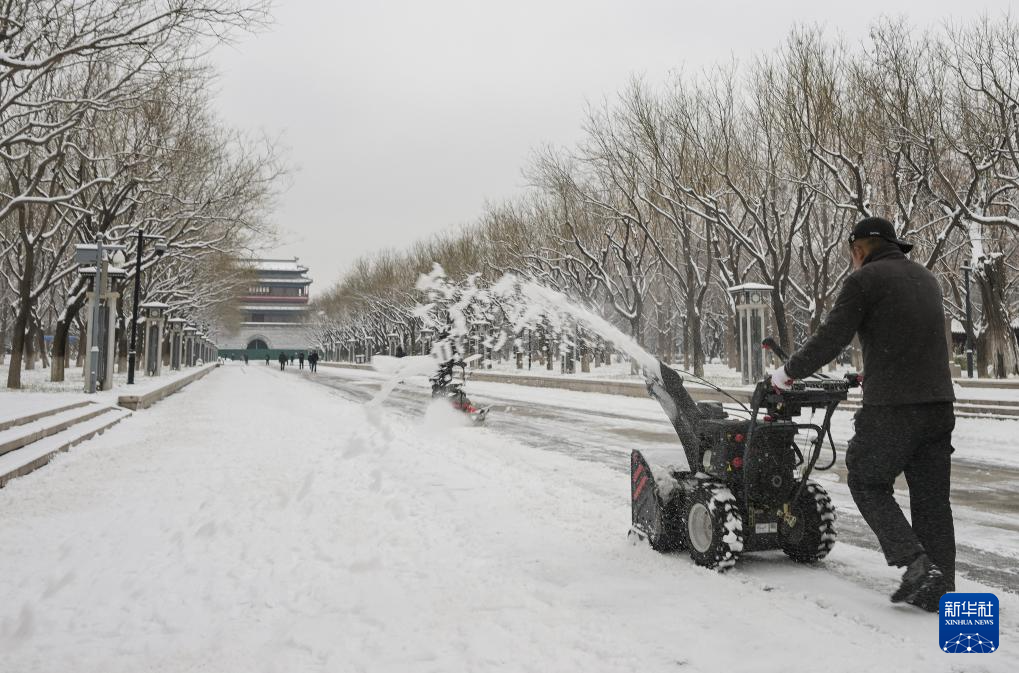 工作人员在永定门公园内的城市中轴线上清理积雪(12月11日摄)。
