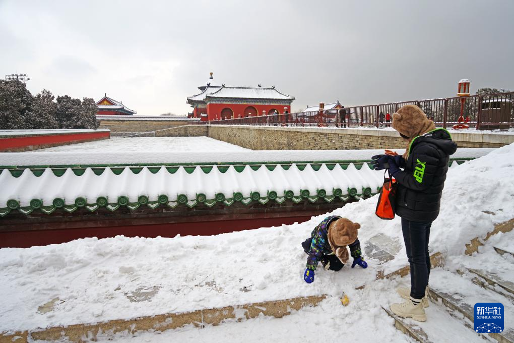 一对母子在天坛公园丹陛桥边玩雪(12月11日摄)。天坛始建于明永乐十八年(1420年),是世界上现存规模最大、保存最完整的古代祭天建筑群,1998年被列入世界文化遗产名录。