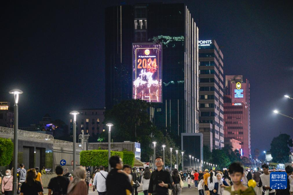 这是2023年12月31日晚在印度尼西亚雅加达拍摄的一块显示有“2024新年快乐”字样的广告屏。