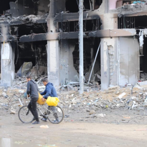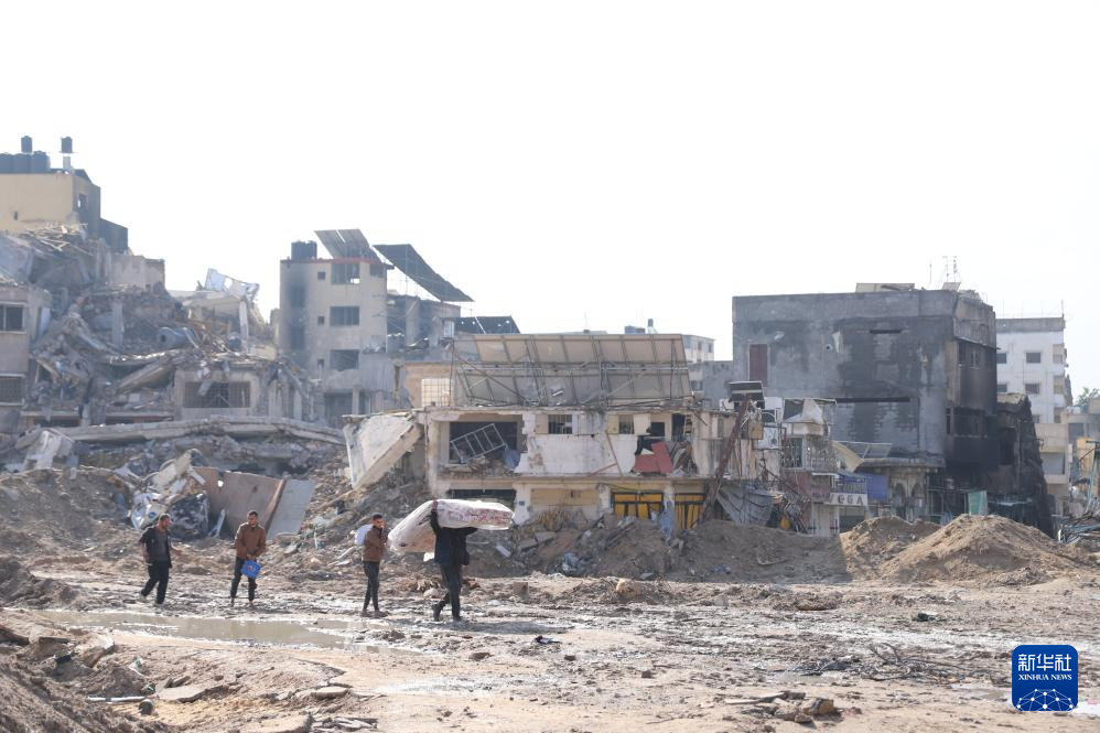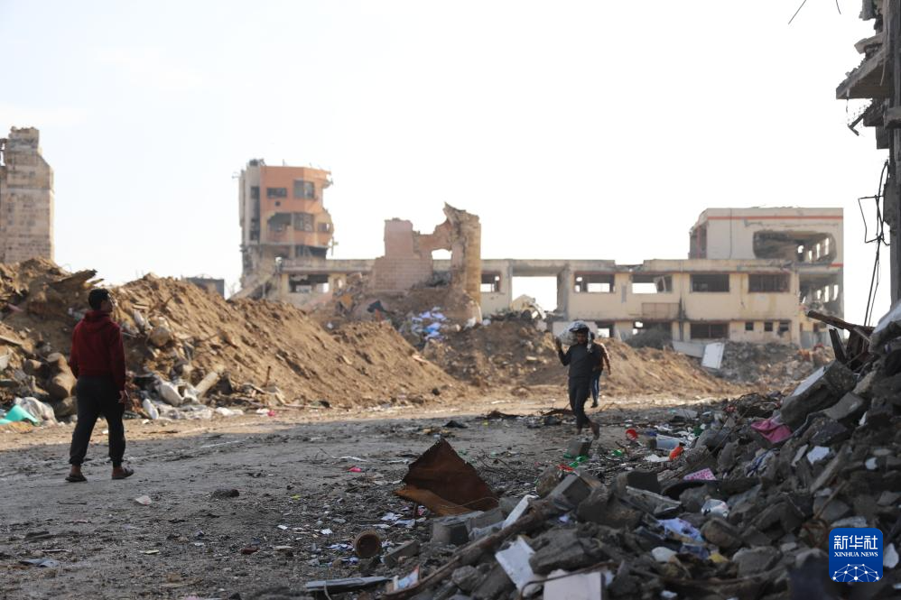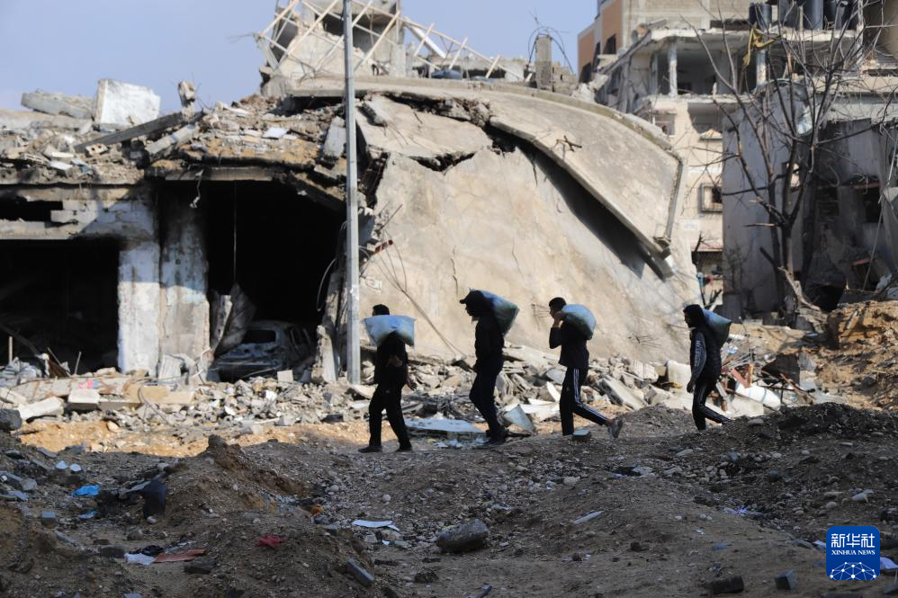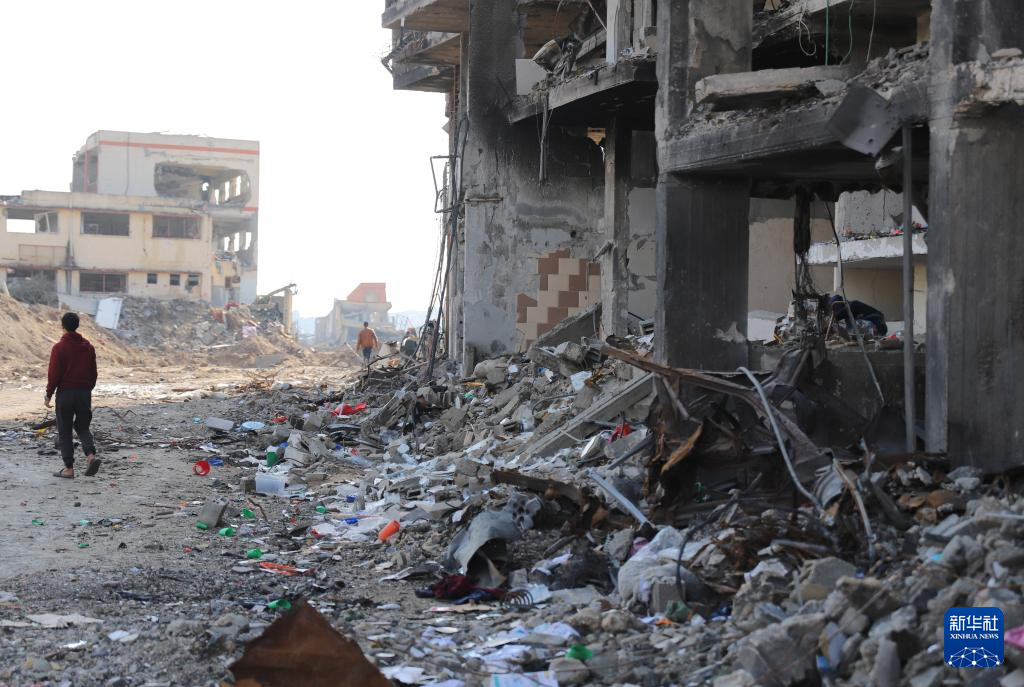 1月2日,人们从加沙城的建筑物废墟附近走过。