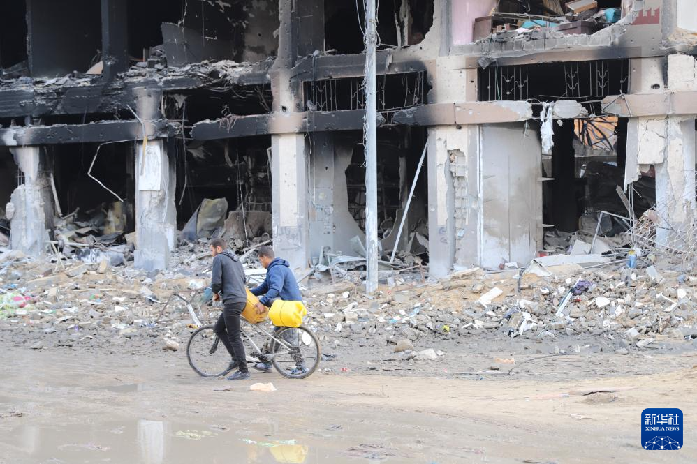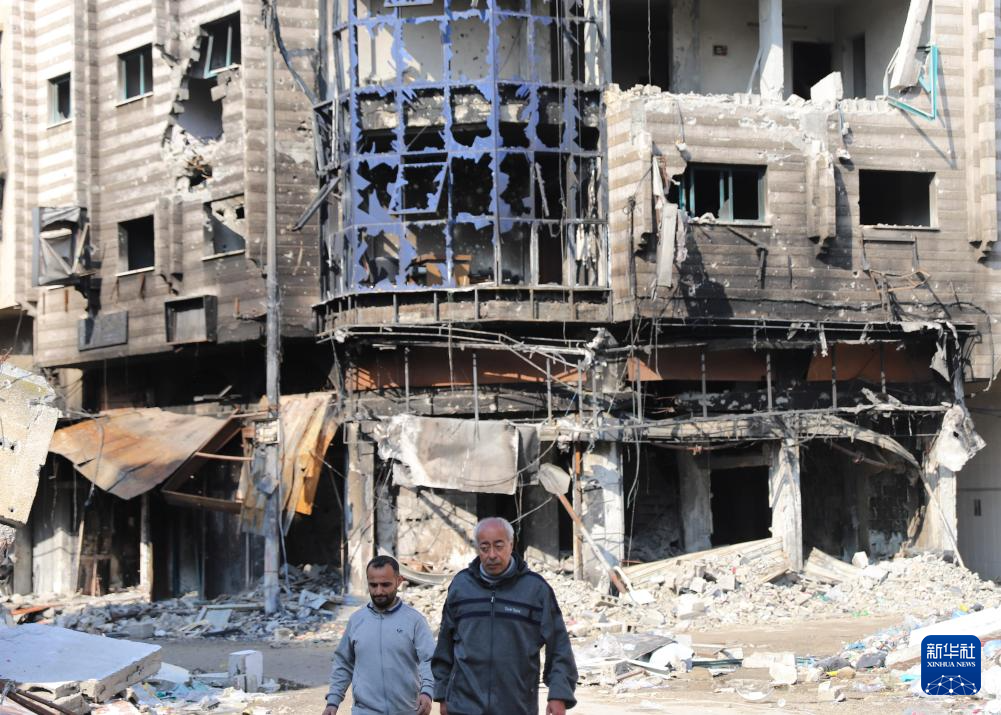 1月2日,人们从加沙城的建筑物废墟前走过。