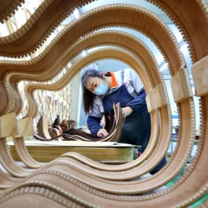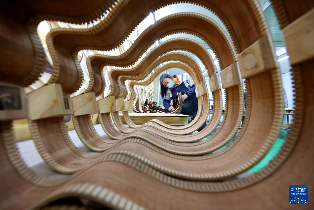 1月4日,在山东省枣庄市永安镇一家吉他生产企业,技术工人在生产吉他产品。