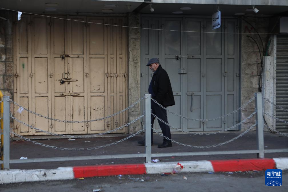 1月3日,在约旦河西岸城市希伯伦,行人经过关门的店铺。