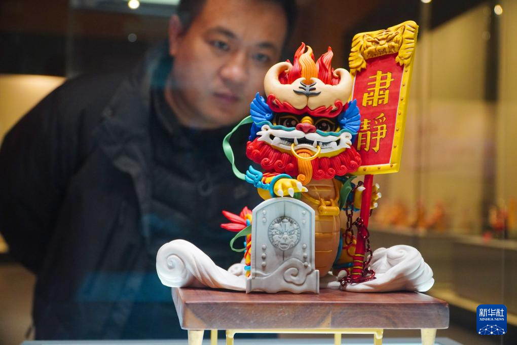 1月5日,参观者在龙年主题软陶艺术作品展上观看《龙生九子》系列软陶作品。