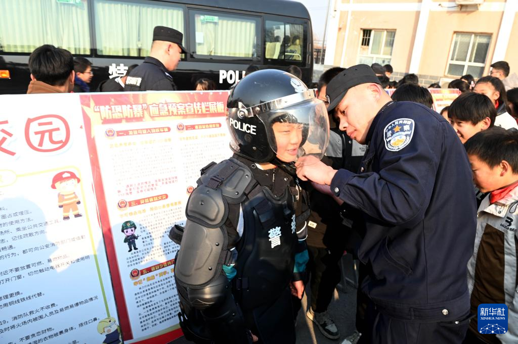 1月9日,河北省邯郸市肥乡区公安局特巡警大队与肥乡区毛演堡镇中心校联合举行迎接警察节主题宣教活动。这是学生在民警的指导下体验警用装备。
