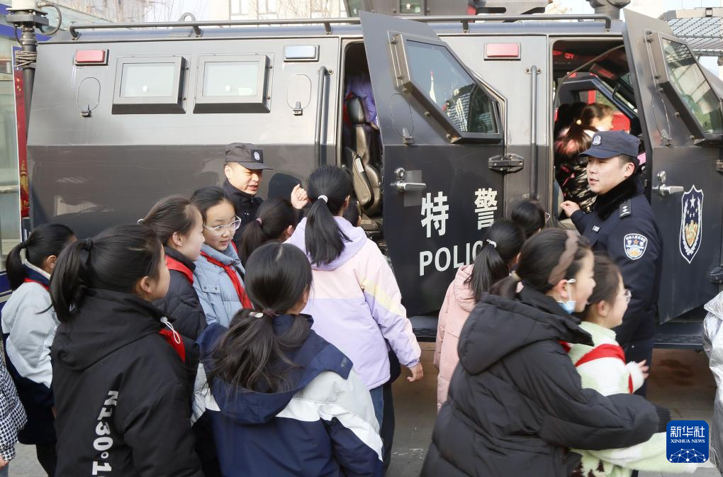 1月10日,河南省洛阳市汝阳县公安局举行警营开放日活动。这是汝阳县外国语小学的小学生在参观特警巡逻车。
