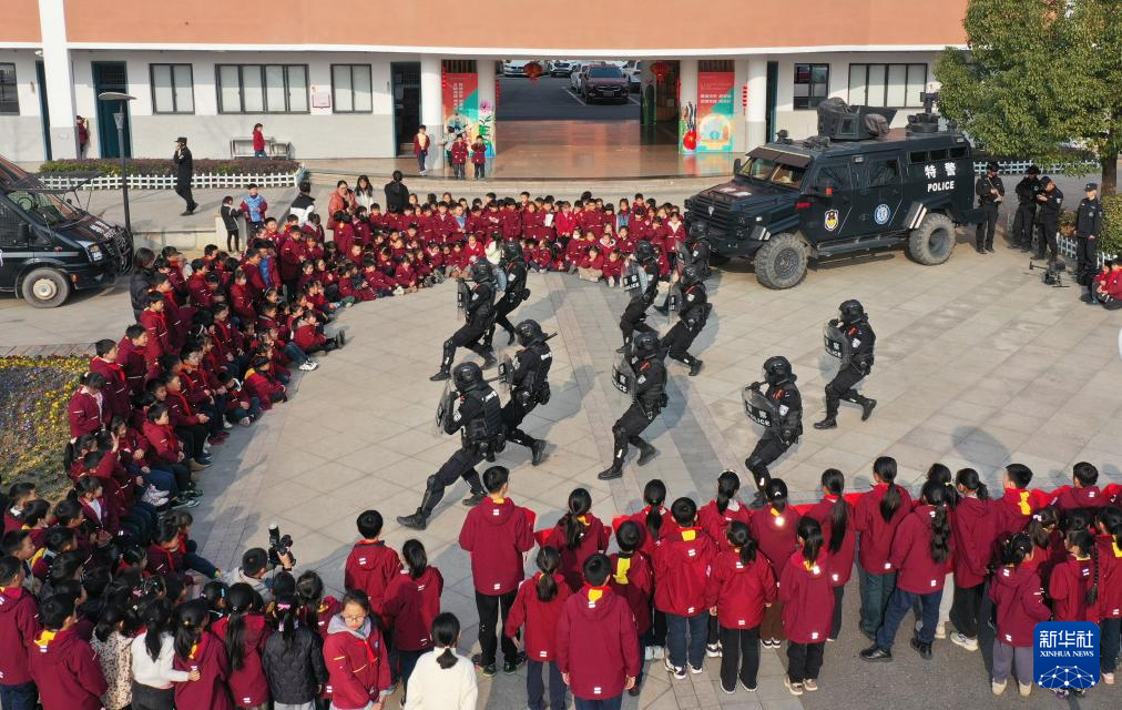 1月10日,浙江省东阳市江北二小操场上,东阳市公安局巡特警大队的队员在给学生展示防暴小队队形变换。