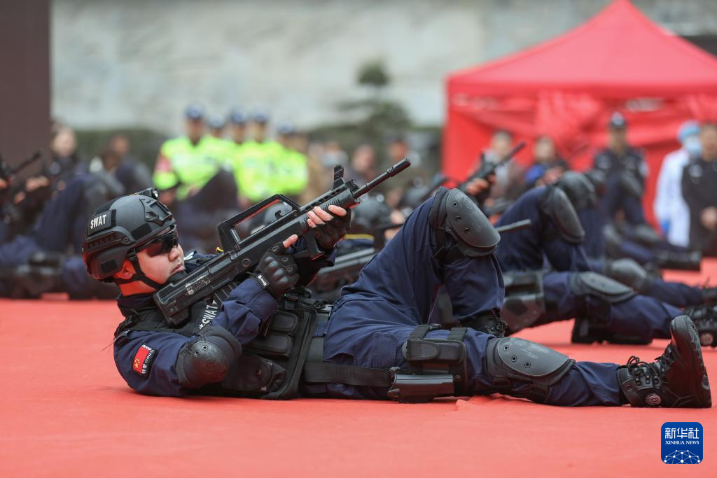 1月10日,在贵州省黔南布依族苗族自治州都匀市,特警队员在展示训练内容。