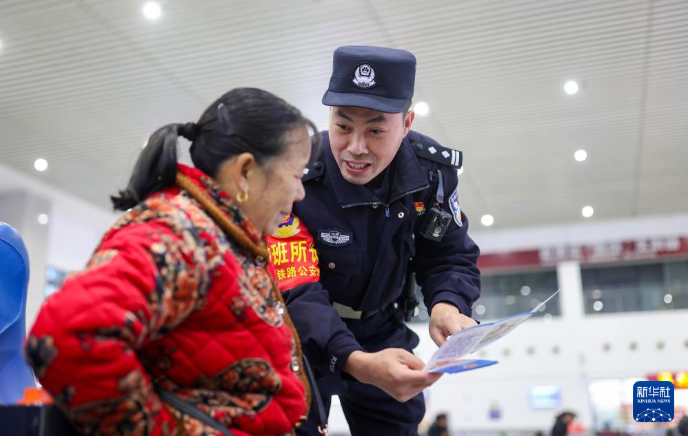 1月10日,成都铁路公安局贵阳公安处铜仁南车站派出所民警向旅客宣传铁路安全知识。